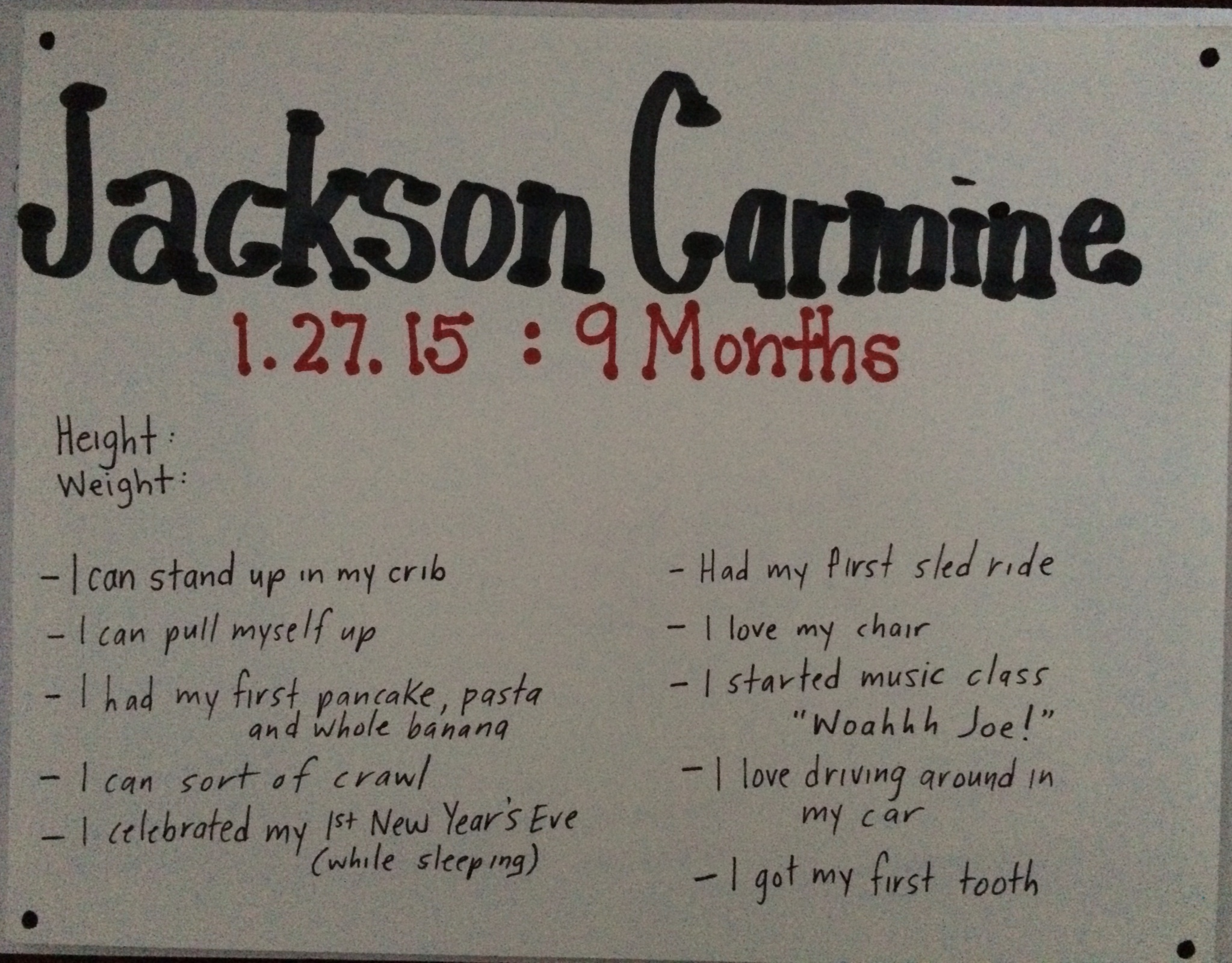 (No height and weight yet, because his nine month appointment was canceled due to the snow. Monday we will get that updated!)