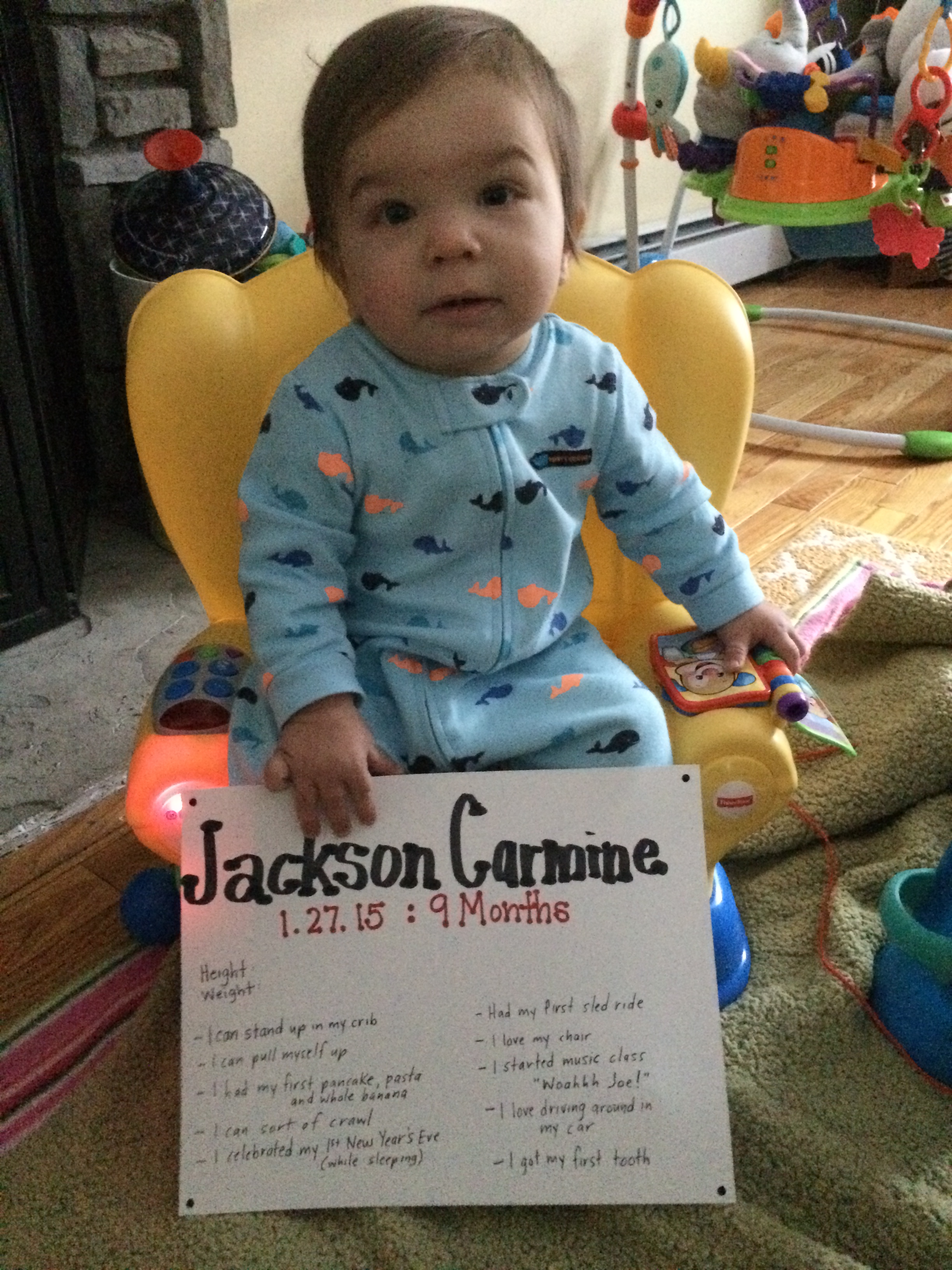 Can you get a better 9 month “birthday” than a snow day? Not in this house you can’t! I CAN NOT believe that this little monster is nine months old already! He’s been outside of mommy’s belly longer then he was inside it! Every single bit of the last nine months have been amazing… scary, funny, exhausting and stressful amazing though!