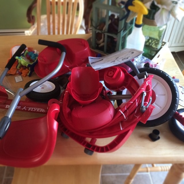 Here is the results of three hours of work, numerous curse words and a tricycle that was supposed to have been built with all the parts included… (I had four left over):