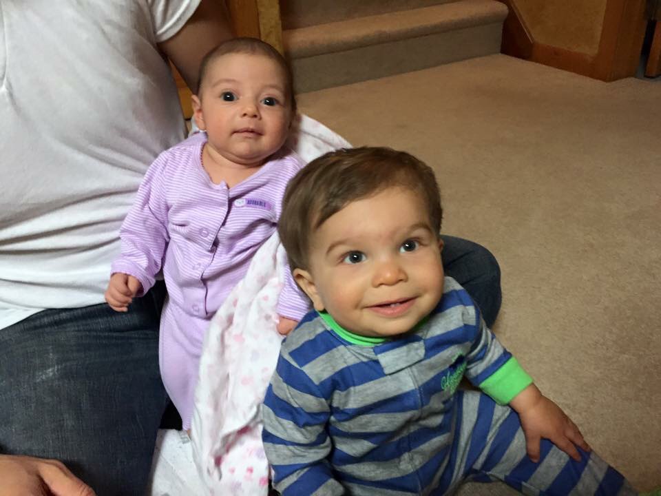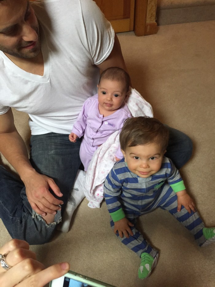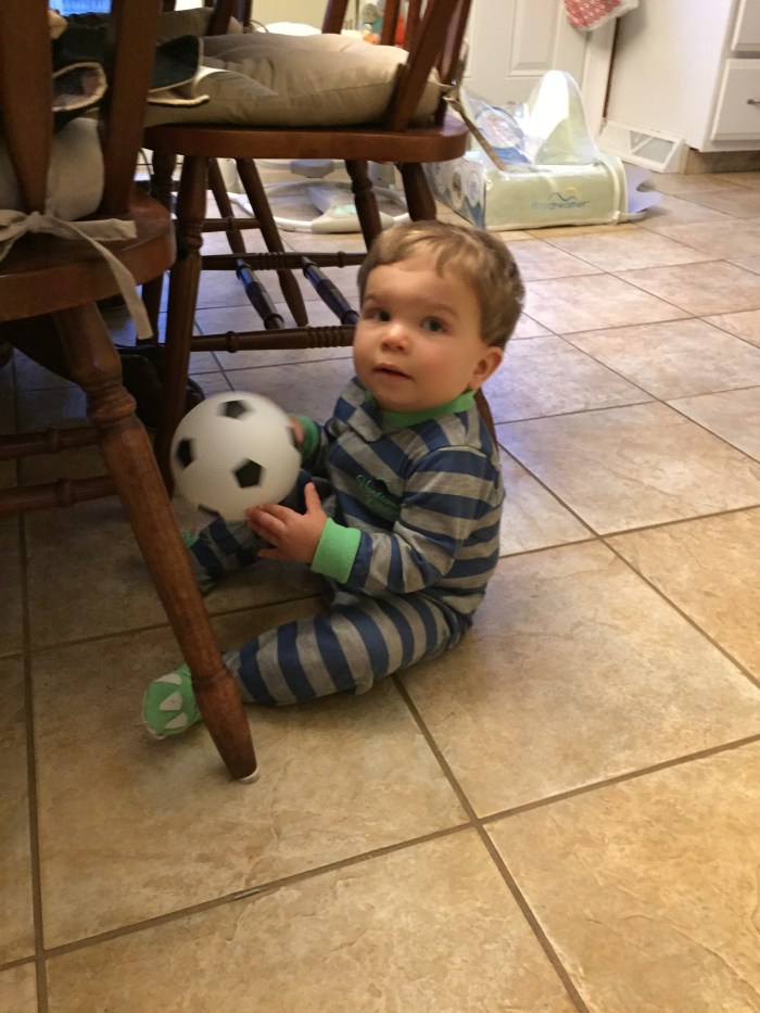 It’s always a lot of fun attempting to get a six week old and one year old to play together.  Jax was happy rolling around on the exercise ball while Luna napped.  (We also found out Jax likes eating gloves!)