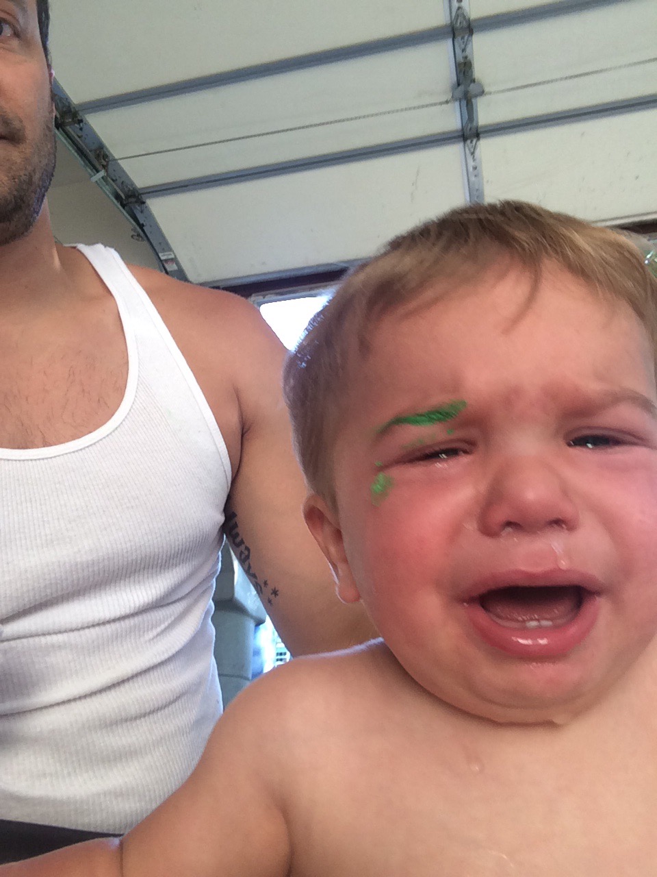 There was crying and drooling and hand over hand painting. There was a green footprint on my shorts and half of one on the canvas and a smearing of paint on legs, arms, eyebrows and the garage floor. There is a good chance this child will never look at paint the same way again.