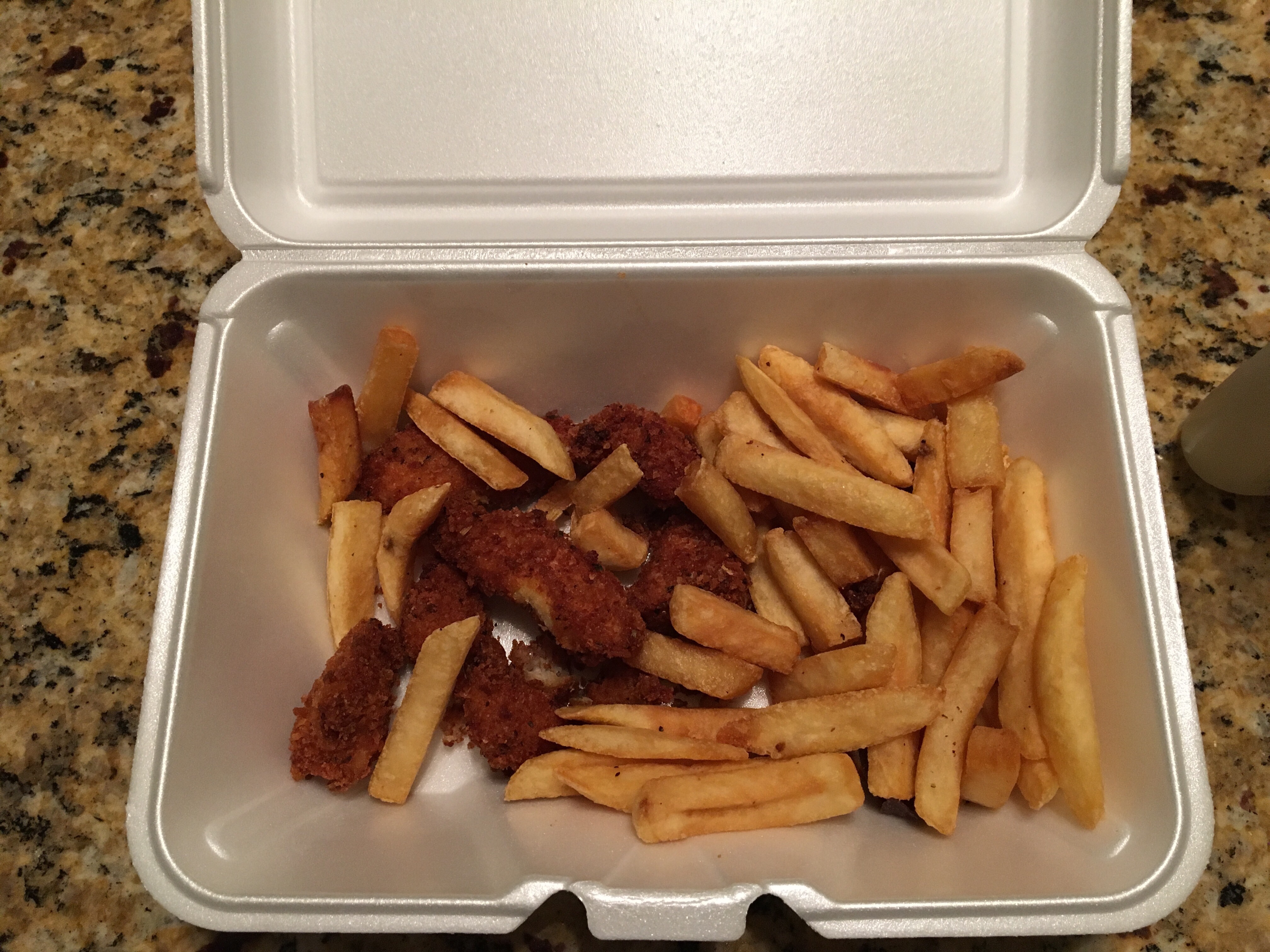 - The fact that he eats like two chicken fingers and French fries and then is full.