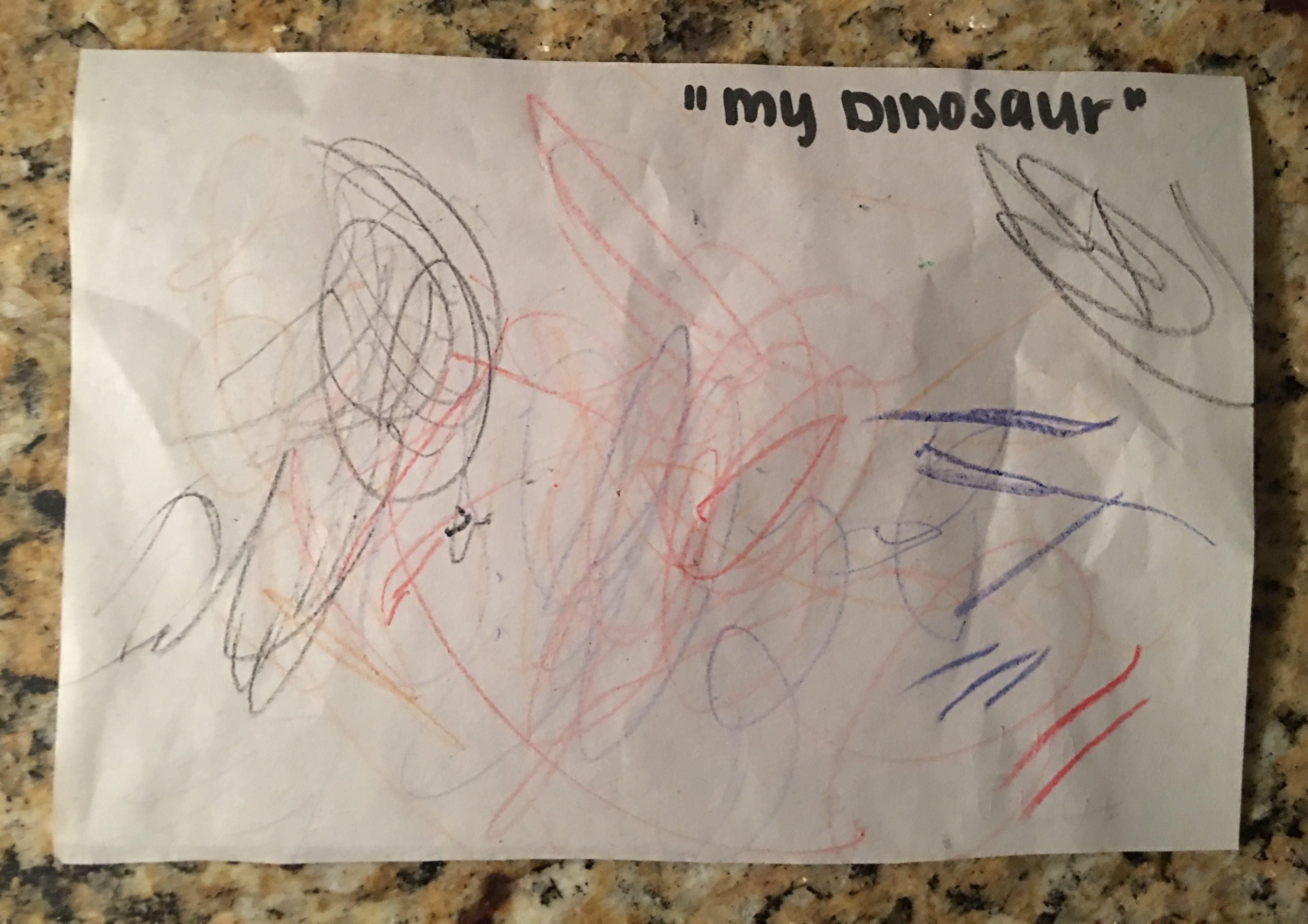 “My Dinosaur” possibly the single greatest piece of art created since the Sistine Chapel. Where does he get this from? No one I know in my family has any visual art talent. Yes there some musical DNA in a few of the family members. But nothing pales in comparison to what I laid my eyes on today.