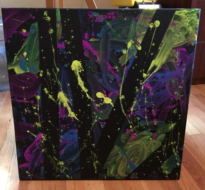 That was until I made a huge error in judgement. I brought Uncle Vinny a present from his godson. Jax has been painting for a while now, however only a few JCF originals were created and as of now there are currently none in circulation (only in private collections). Literally… With in seconds two different woman were at the table asking about the painting. One made reference to blue and purple being her favorite colors and the other how amazing it would look in her living room. I felt like I was at an art auction. They got up to a final offer of $350 cash on the spot.