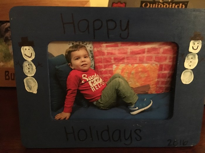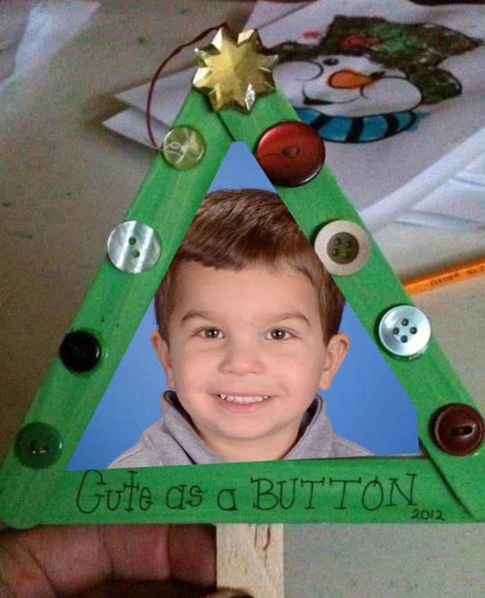 So it’s about that time where we start getting homemade Christmas presents from Jackson. He’s hit that age where he makes ornaments googlie-eyed closepins that resembles a reindeer. Or a pop sickle stick Christmas tree with his school picture in it that 25 years from now we can give him to put on his tree so we can laugh at how cute he was and how messy his finger painting skills were.