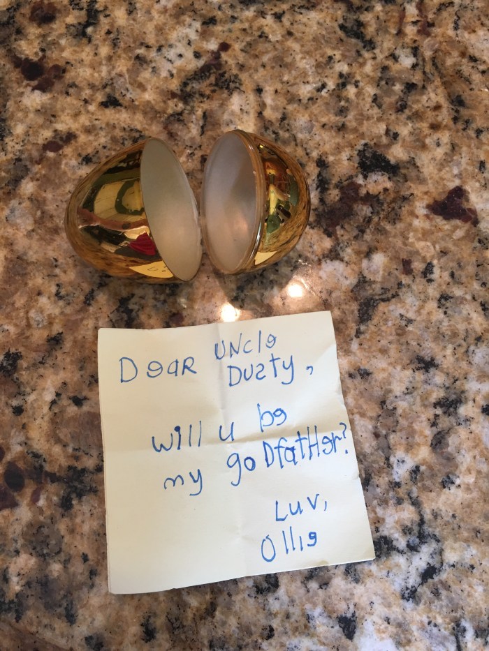 No bunny stuff here… we’re talking Godparents Naming Day. Big stuff… nothing to joke around with. Picking godparents is like picking a life vest when you are on a cruise. You hope you don’t ever have to use it, but just in case you know you have to pick well.