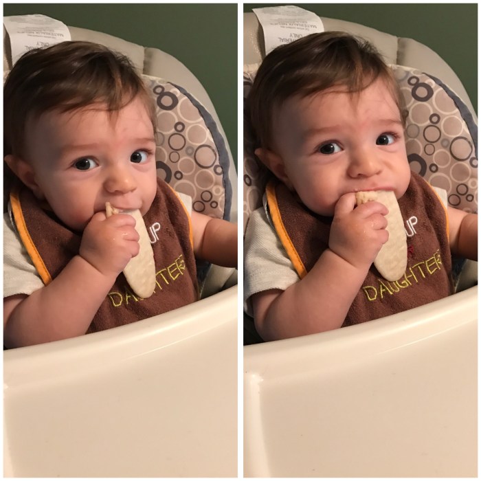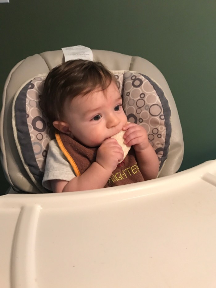 So Ollie is eating some apples, bananas and pears, you know the usual beginning solids. He eats pretty well. Granted the majority winds up on his shirt or bib if we’re smart enough to remember to put one on. I feel like he’s kinda blasé when it comes to the those foods though. You know just down the throat and then into the diaper. It’s all just part of the process.