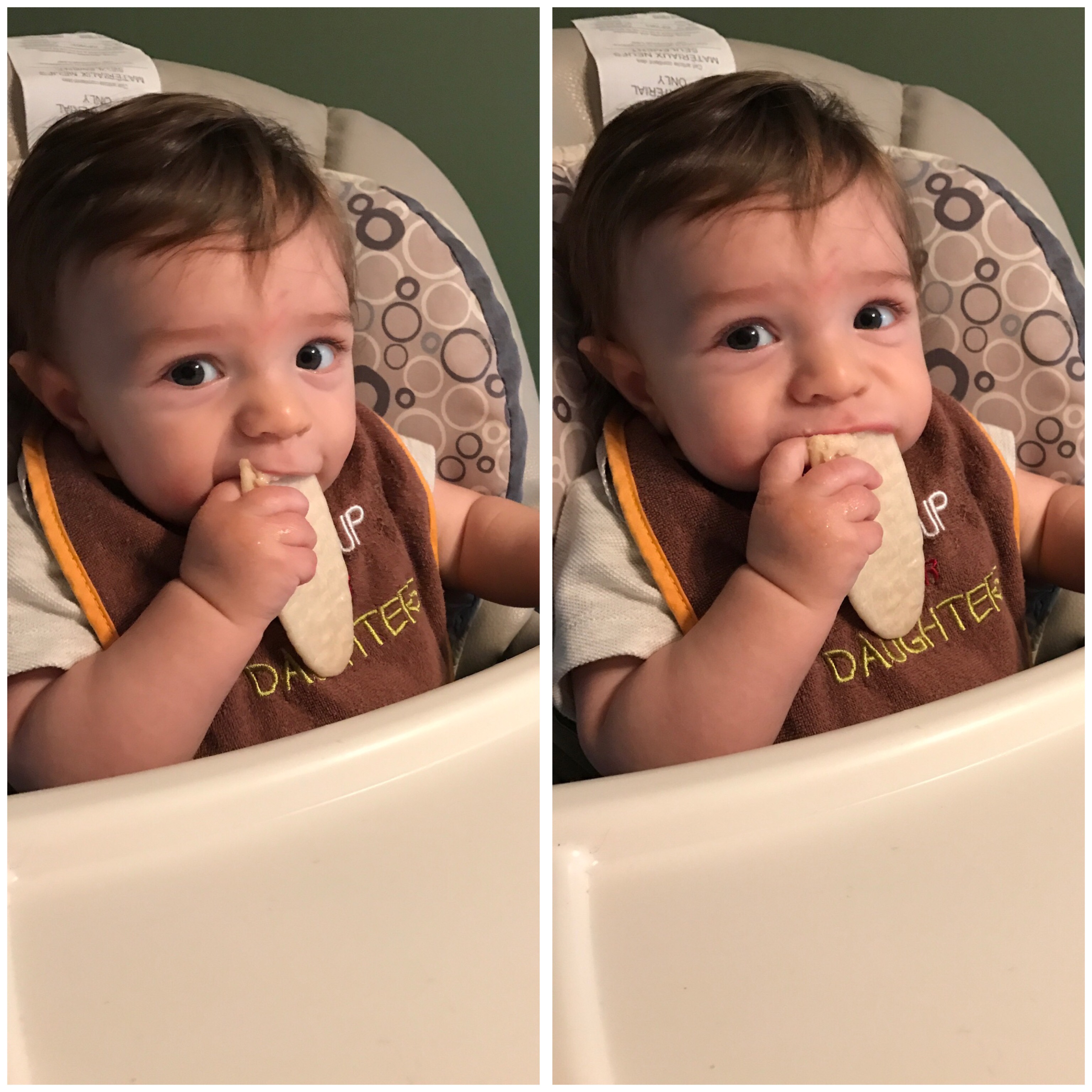 That was until we introduced these teething wafers… (reminded me of taking communion). As soon as that Eucharist touched his lips it was instantaneous heaven (no pun intended). He literally grabbed this holy wafer with both hands and wouldn’t let go. It was like trying to get a bone away from a starving dog. Oliver showed the world that you won’t ever get your hands on his church crackers, no way- no how… not with his two handed- death grip clutching on for dear life… not unless you want to lose some fingers in the process.