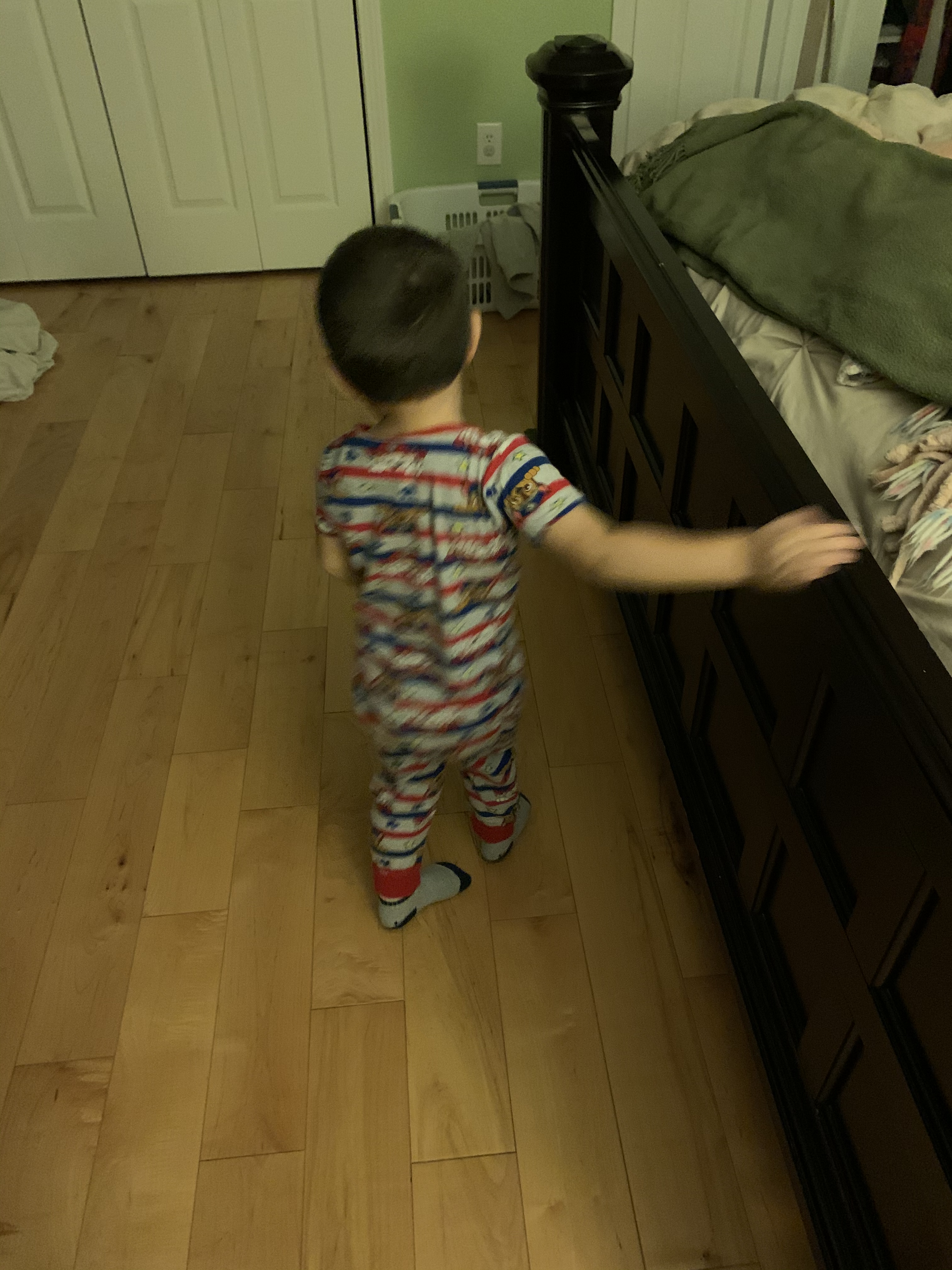 Bottom line, he won’t stay in the damn bed. We put him in he slid out, walked down the hall and let himself in our room. Over and over and OVER again.