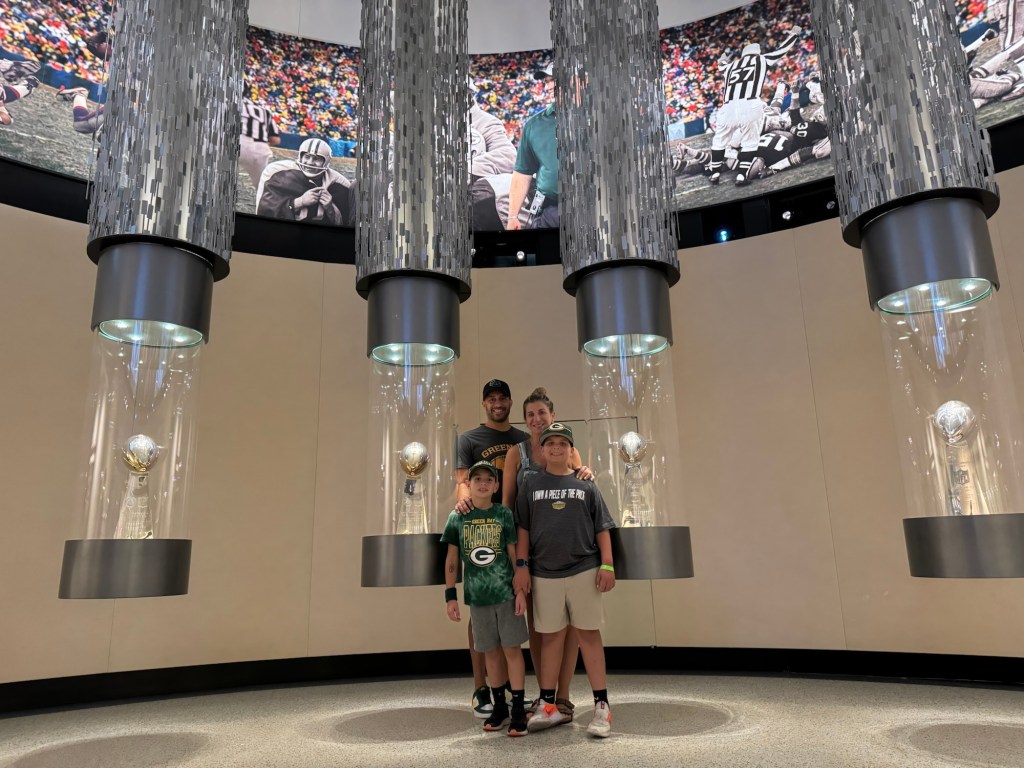 Inside the stadium, everything felt amplified. We took the tour. We walked the halls. Later in the trip we would step onto the field and stand beneath the goalposts, trying to fully process the fact that we were standing where legends stood. In the Hall of Fame, the Lombardi Trophies gleamed behind glass, and for a moment the boys were quiet. Not because they were bored—but because they were registering something bigger than themselves.