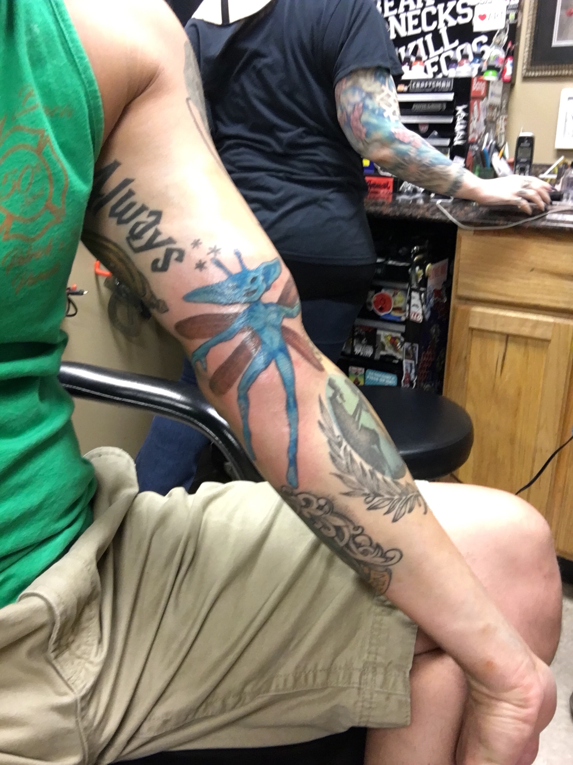 My most recent tattoo is just as special to me as the other ones I’ve gotten that were dedicated to my sons. The first time I visited the Harry Potter theme park in Orlando, Stephanie and I were walking out after a long hot day and as we pass a shelf loaded with stuffed animals and other HP merchandise, Jax starts pointing and laughing uncontrollably. He was pointing at the blue Cornish Pixie hanging on the shelf… so of course we bought it for him. He still has it to this day… so I got his Pixie (that he calls Pickie) on my inner arm.