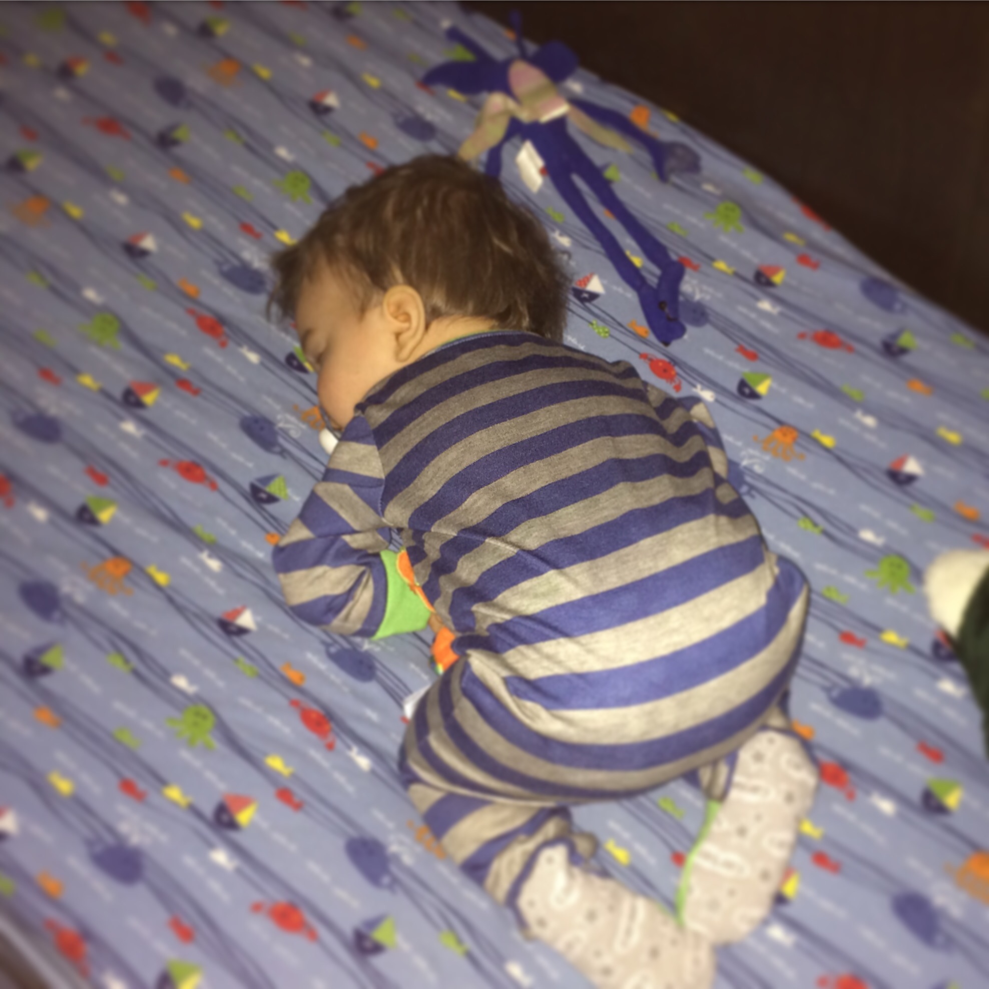 Snuck in to say good night… He’s all curled up tight, clutching his #blanky with his #CornishPixie napping by his side! #HarryPotter