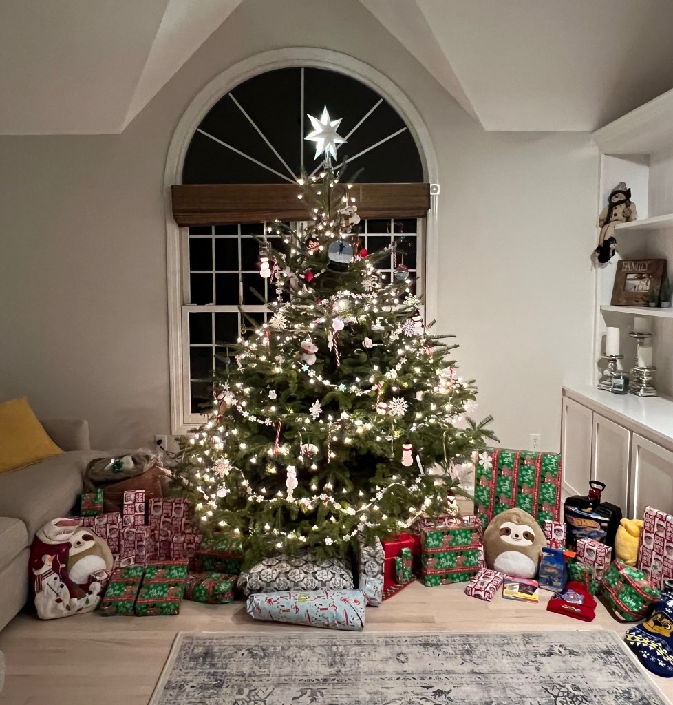 I walked down stairs to multiple rolls of toilet paper carefully patterned and intricately placed like lacy garland on the ensues of the tree branches. I watched as Elfie sat, embarrassed perched high atop the Douglas Fir. Embarrassingly realizing that he would have to take credit for this “prank”.