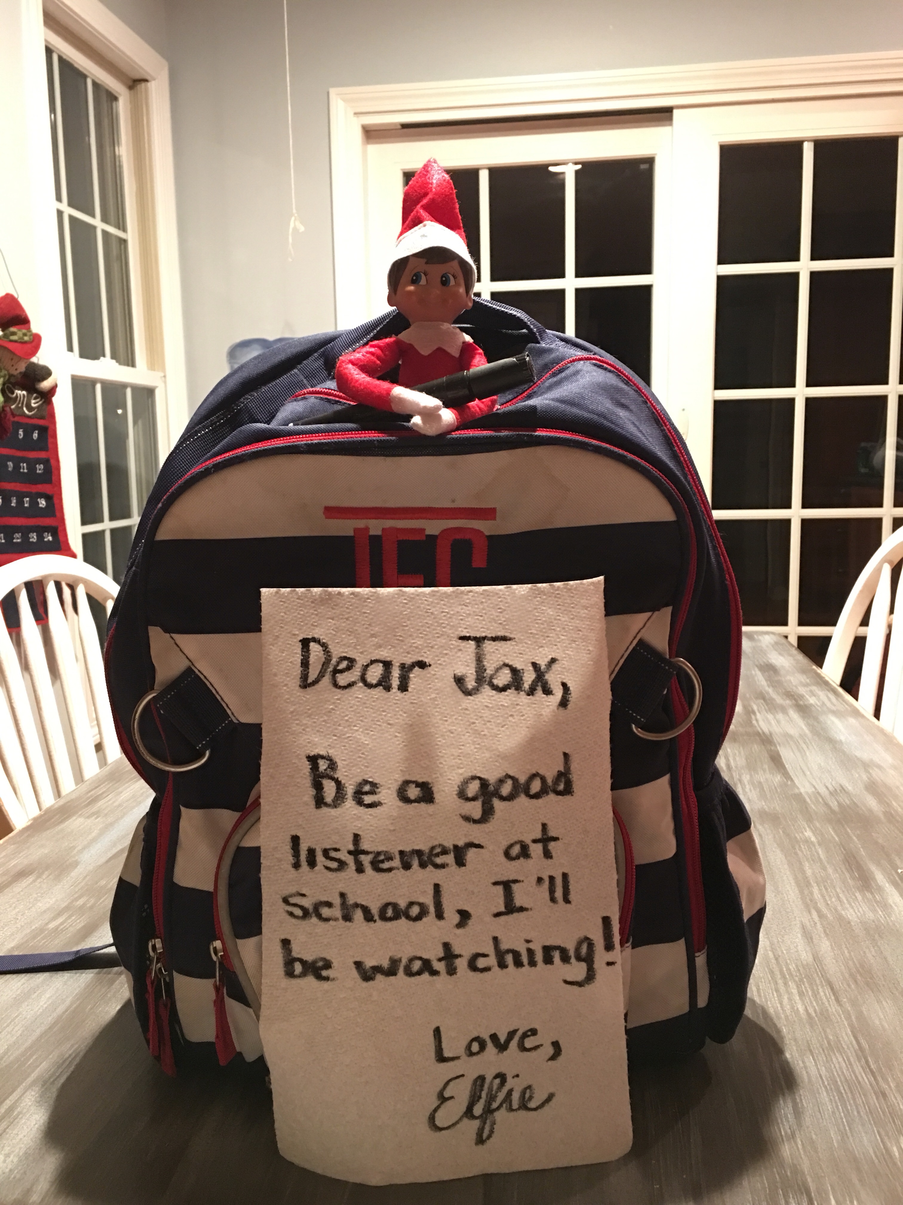 Case in point… RULE NUMBER ONE of fight club… don’t talk about fight club… RULE NUMBER ONE of Elf on a Shelf… don’t touch the Elf on a Shelf. To Jax this means… literally not only touch the Elf, but take him and body slam him repeatedly and then launch him into orbit. We’re screwed with this kid… Santa I hope you packed enough coal.