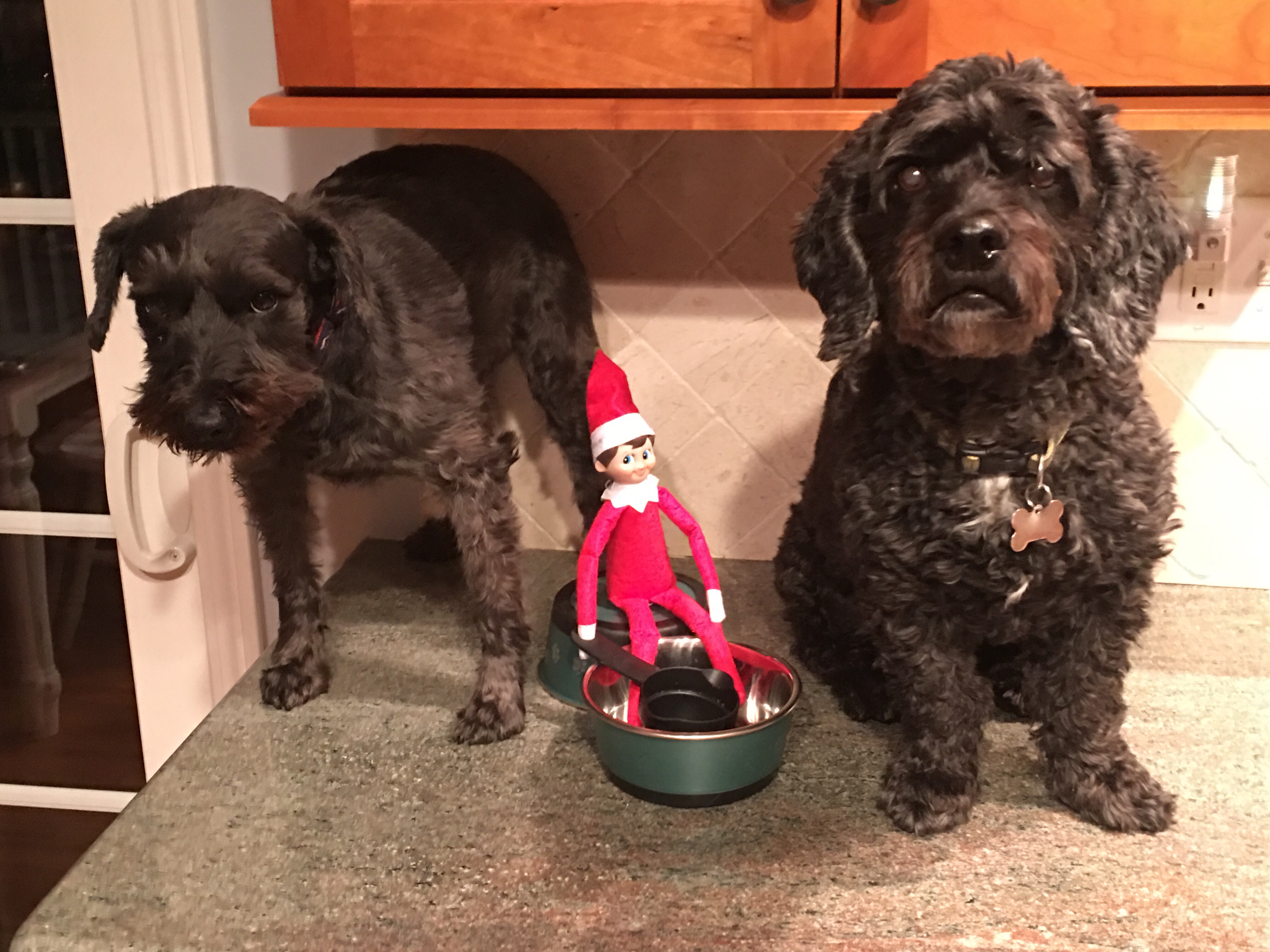 And this effectively ended Elfie’s life… you don’t sit near, let alone in, Buster and Max’s food bowl and expect to live to tell the story. Thanks for a fun run Elfie… sorry your hat and leg were gnawed off.