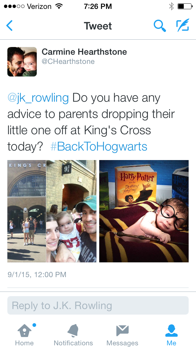 I am 37 years old and just became an elementary school principal and I now have a son who turned three this past spring and another who is five months old. Like most of us who are now in our 30s, we grew up alongside the amazing world of Harry Potter, and the impact it has made on our life is hard to quantify. For my generation, (although I joined the wizarding world a little later than most of my peers), Harry Potter is a close friend and trusted companion. We came of age with the the young boy who found who he really was after leaving the “cupboard under the stairs” and we have now taken him into adulthood with us. I can’t imagine a childhood without him, and I’m so glad he’s stuck around as I’ve grown older.