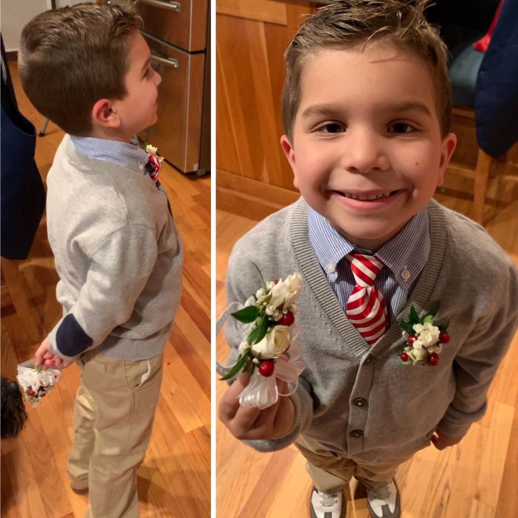 I’ve never seen Jackson so excited. He couldn’t wait to put on his “suit” and pin on his boutonnière. He was changed and waiting at the door with mom’s flowers for a half an hour!