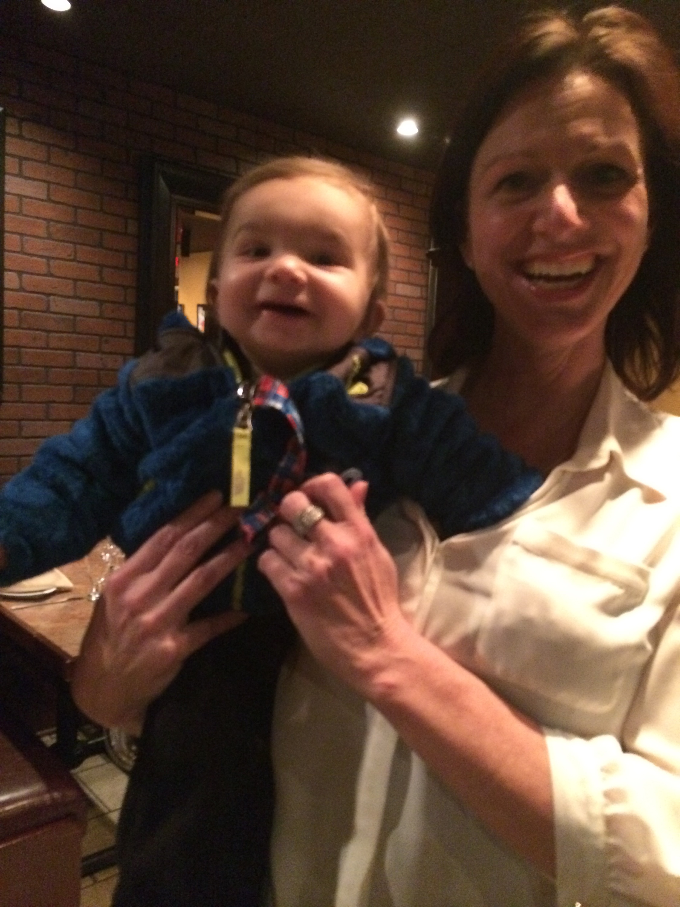 Tonight was a prime example of what I’m talking about. Let me set the stage: Mom and I are out to dinner at a nice, small restaurant that we’ve been to enough were the people there know us. We are seated and notice Auntie Sue sitting across the room. She promptly comes over and scoops up little Jackson giving Mom and I a few needed minutes to chat and eat by ourselves. Until… Auntie Sue and Jax turn the corner and we see this: