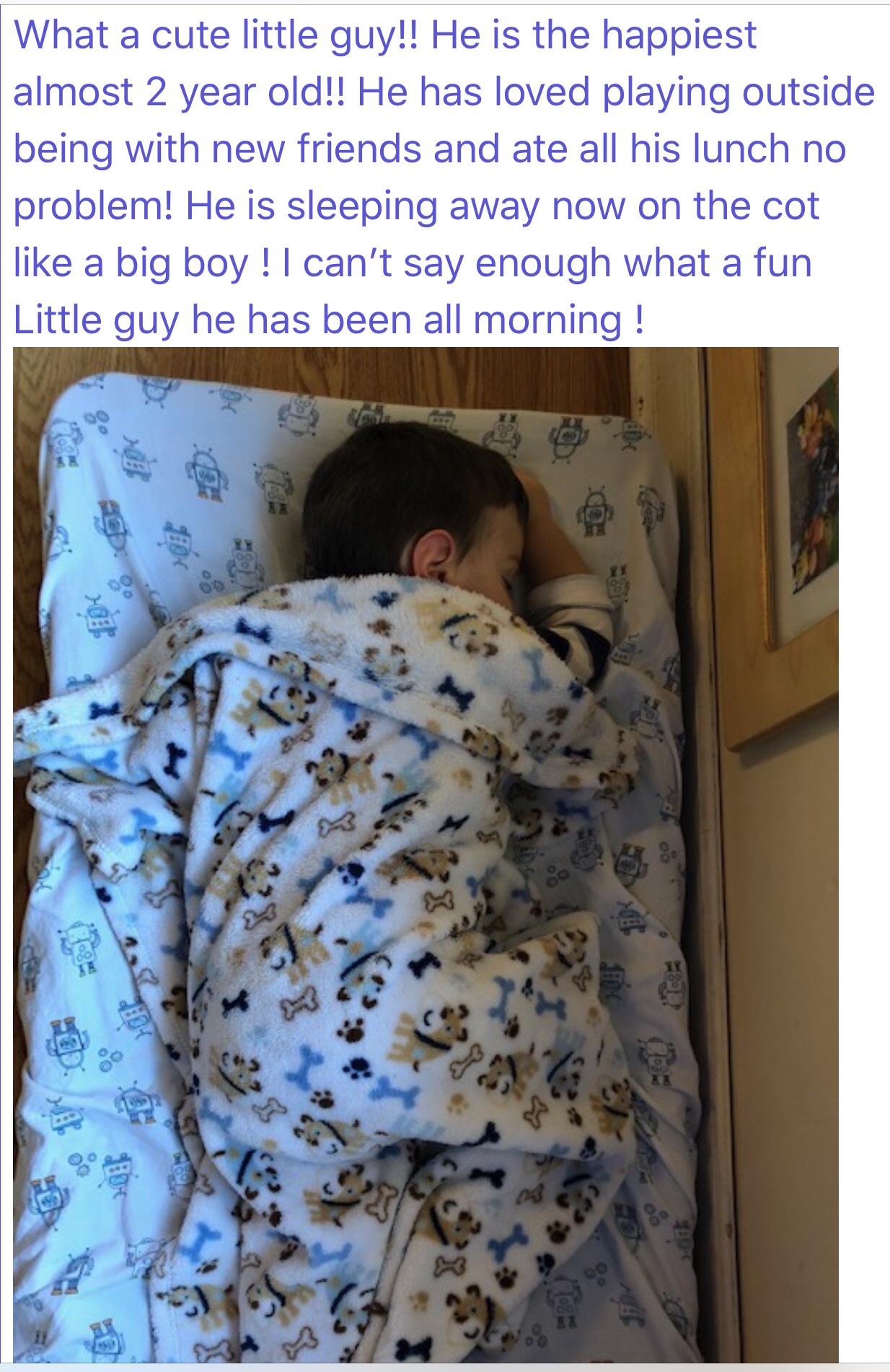 … until today. Until the day he finally found a place to call home and a cot to call his own. (Don’t get me wrong where he was previously was amazing. They treated him like family. They communicated more than I could ever have imagined and he loved it there). But now… he’s home. He’s the little Italian boy… in the little Italian daycare.