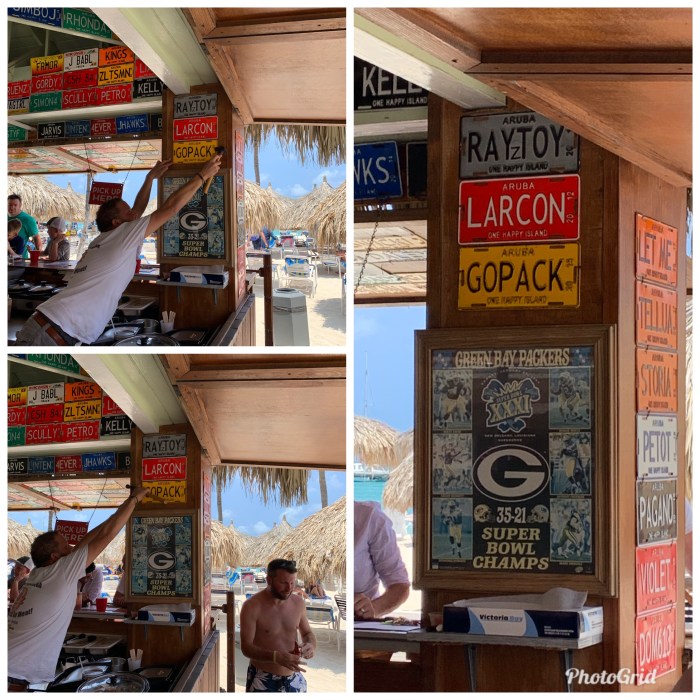 Matt, the new owner has kept the Packers memorabilia up and has added more license plates from all over Aruba. When I told him the story about the first time I met Scott, he grabbed a hammer, took down that Packers license plate from all those years ago and gladly handed it over to me. That golden “GOPACK” plate from “One Happy Island” will display nicely in the basement and remind me and the boys of our first vacation together, of the warm ocean, the hot sun, some great food and the fact that Packers fans are everywhere.